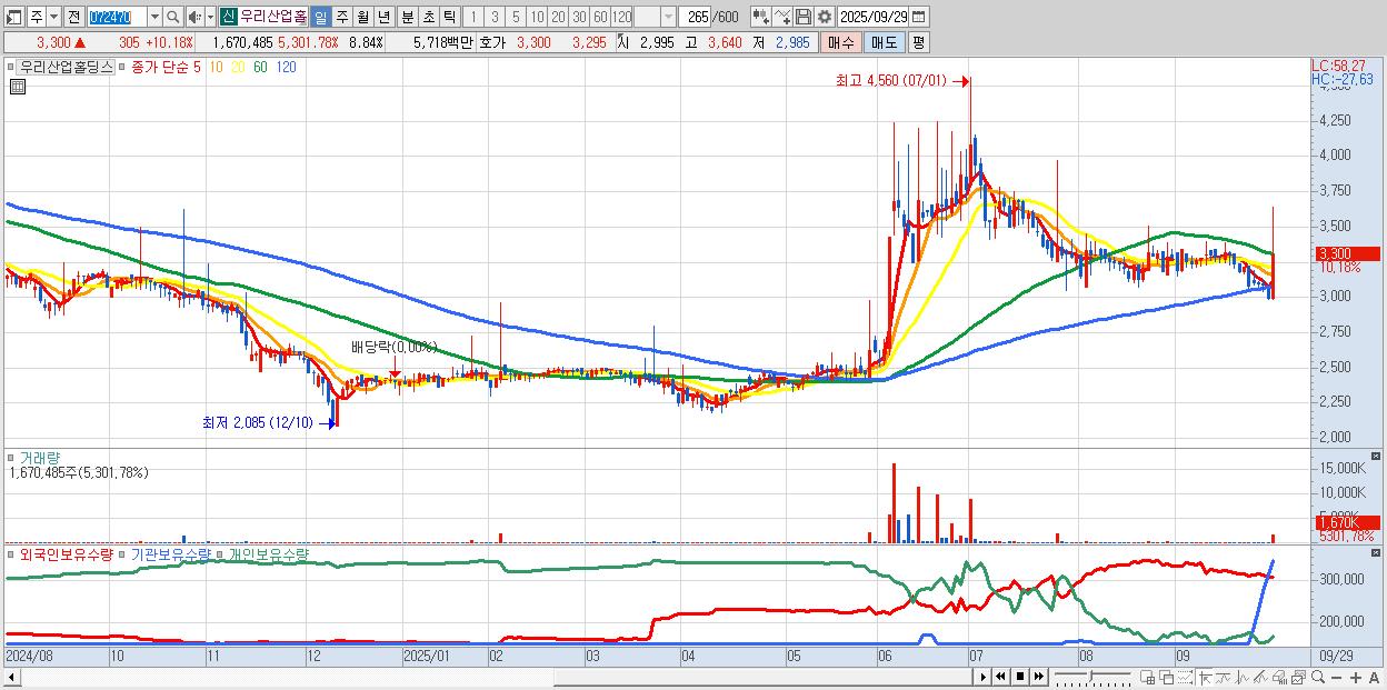 - 우리산업홀딩스 (3,300원 ▲ 10.18% , 시총: 623억, 거래량: 1,670,485, 거래대금:57억)