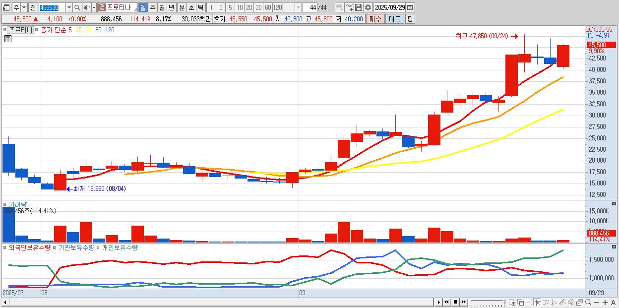 30.프로티나 45,500원 ▲ 9.9% (KOSDAQ, 468530)