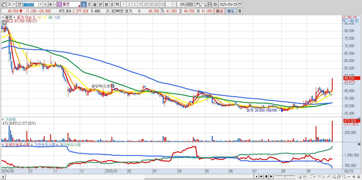 - 툴젠 (48,550원 ▲ 29.99% , 시총: 4,200억, 거래량: 235,512, 거래대금:108억)