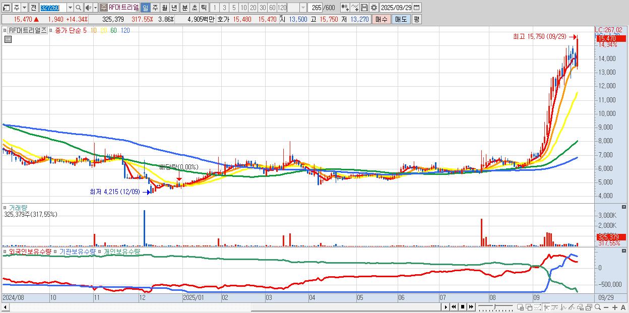 - RF머트리얼즈 (15,470원 ▲ 14.34% , 시총: 1,305억, 거래량: 325,379, 거래대금:49억)