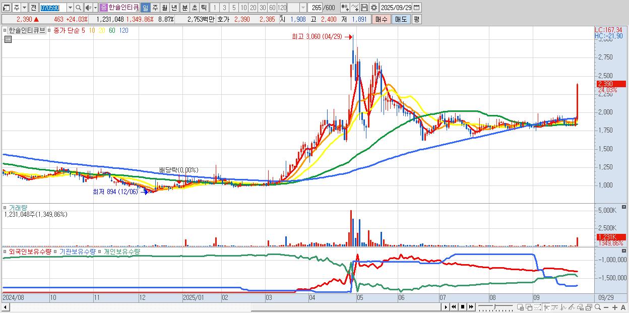 - 한솔인티큐브 (2,390원 ▲ 24.03% , 시총: 332억, 거래량: 1,231,048, 거래대금:28억)