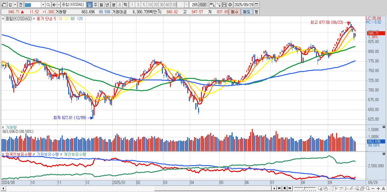 | 09/22 | 874.36 | ▲1.30% | 1,231억 | -410억 | 185억 | -1,006억 |