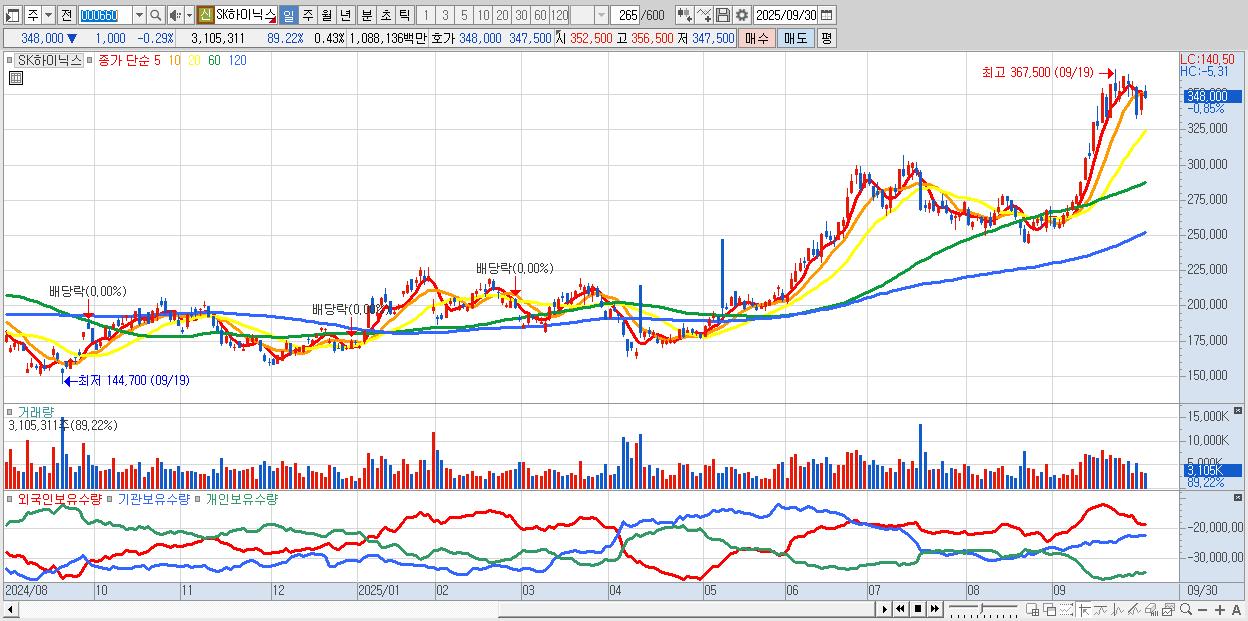 - SK하이닉스 (347,500원 ▼ -0.43% , 시총: 2,529,808억, 거래량: 2,238,614, 거래대금:7,836억)