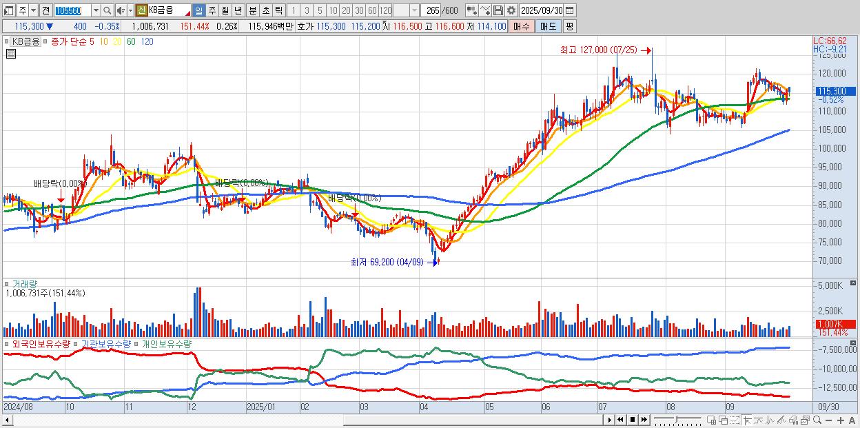 - KB금융 (115,500원 ▼ -0.17% , 시총: 440,589억, 거래량: 960,038, 거래대금:1,106억)