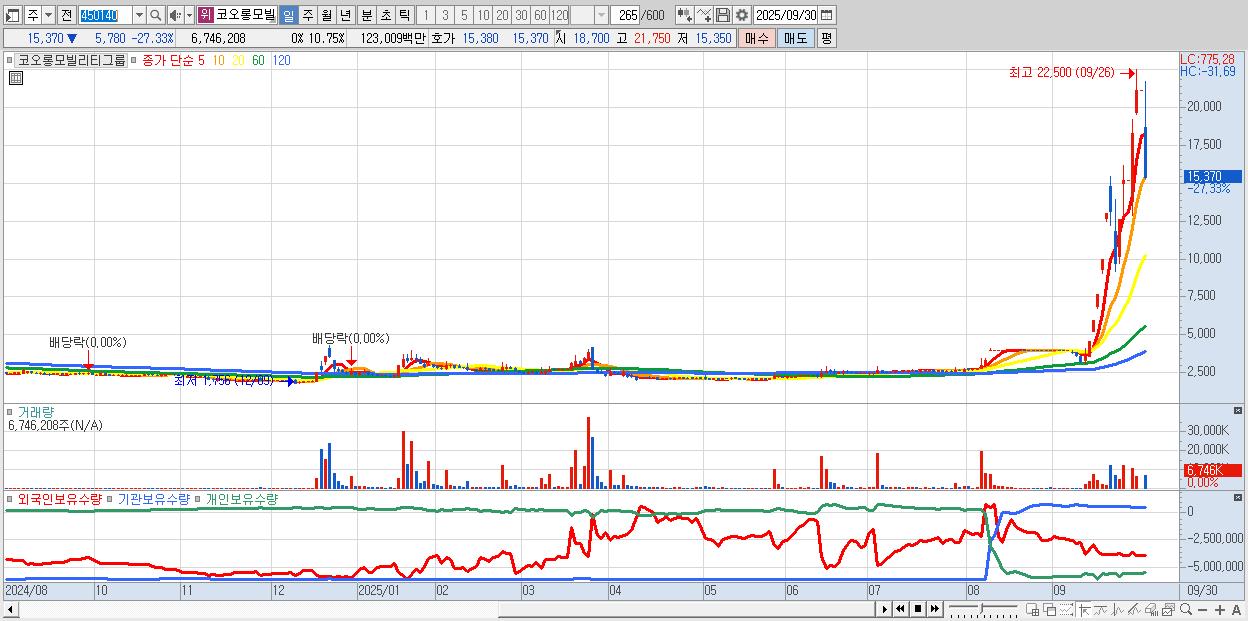- 코오롱모빌리티그룹 (15,370원 ▼ -27.33% , 시총: 9,649억, 거래량: 6,746,208, 거래대금:1,230억)