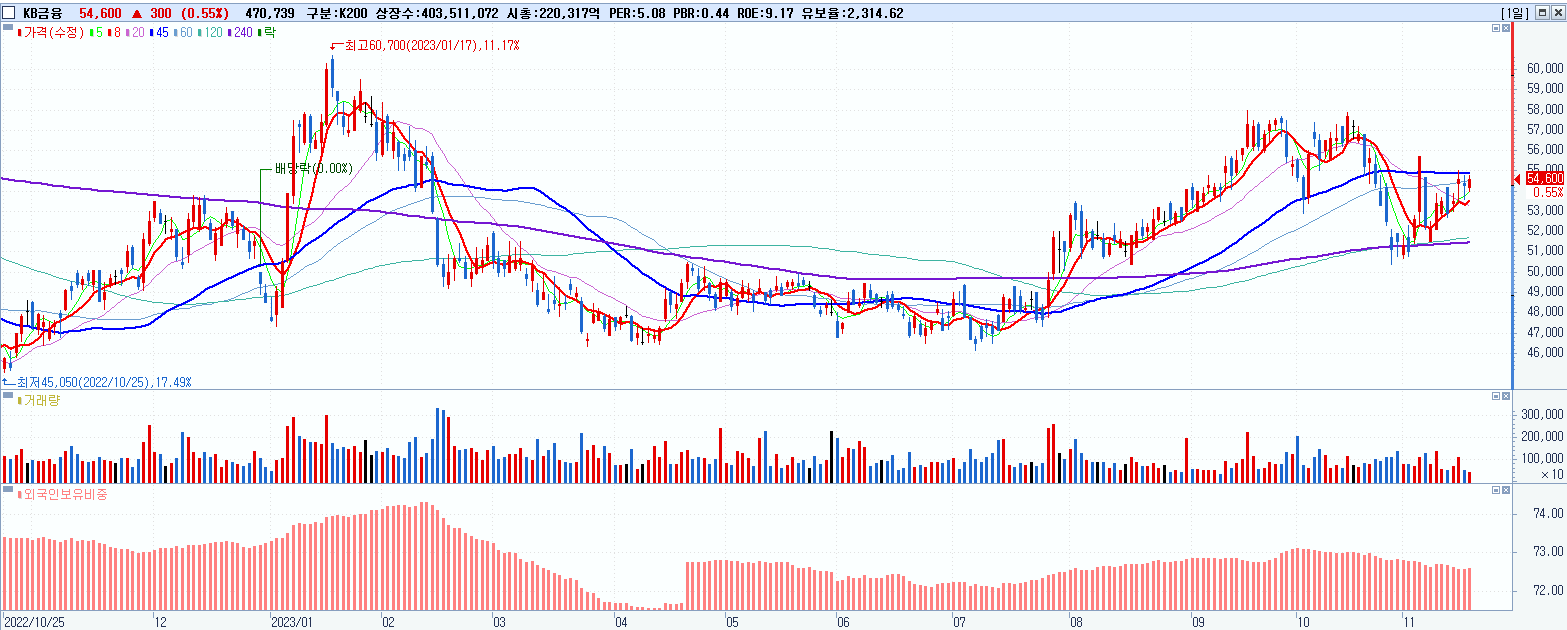- KB금융 (54,600원 ▲ 2.06% , 시총: 220,317억, 거래량: 3,567,771, 거래대금:1,926억, KOSPI)