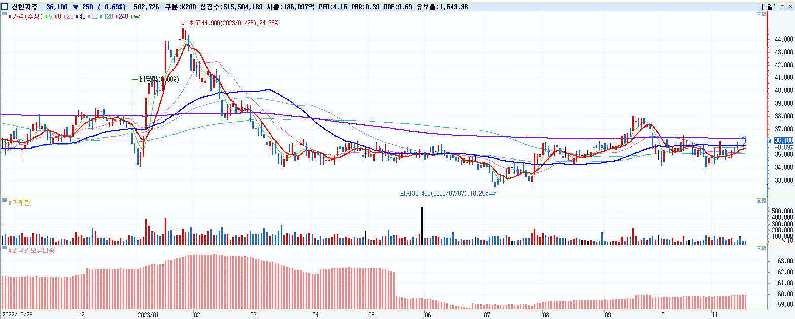 - 신한지주 (36,100원 ▲ 2.27% , 시총: 186,097억, 거래량: 3,553,243, 거래대금:1,280억, KOSPI)