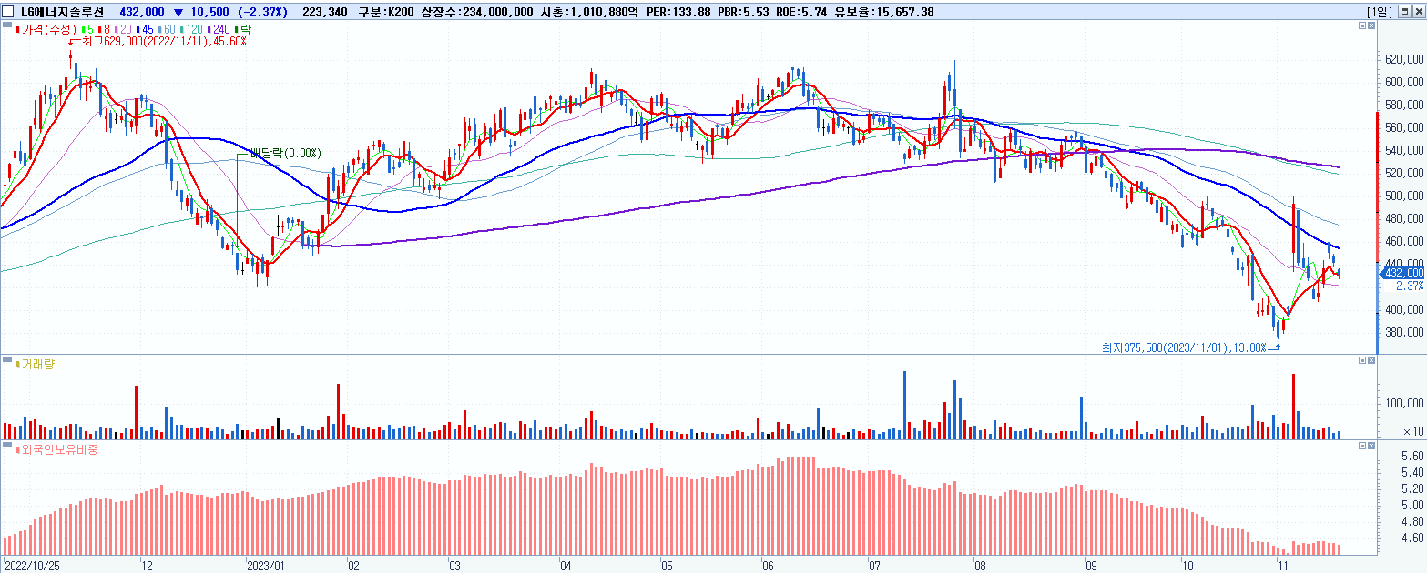 - LG에너지솔루션 (432,000원 ▲ 5.11% , 시총: 1,010,880억, 거래량: 1,340,004, 거래대금:5,842억, KOSPI)