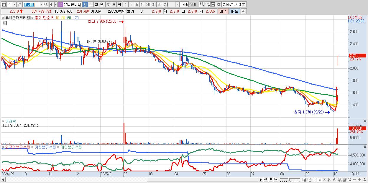- 유니온머티리얼 (2,210원 ▲ 29.77% , 시총: 928억, 거래량: 13,379,606, 거래대금:294억)