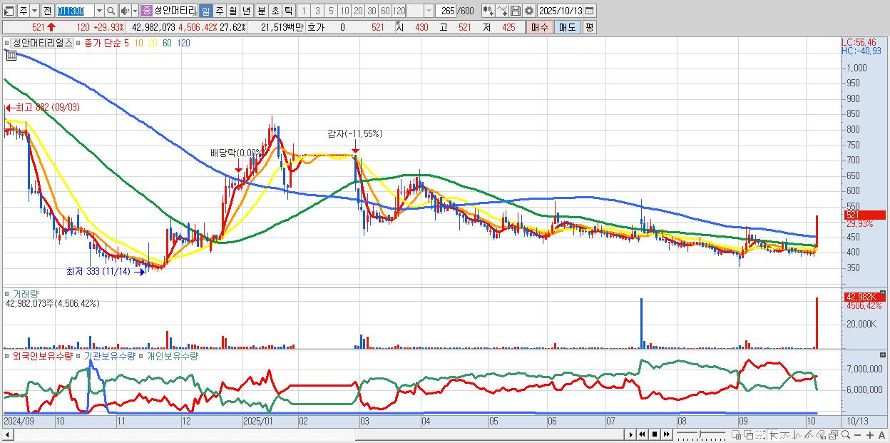 - 성안머티리얼스 (521원 ▲ 29.93% , 시총: 811억, 거래량: 42,982,073, 거래대금:215억)