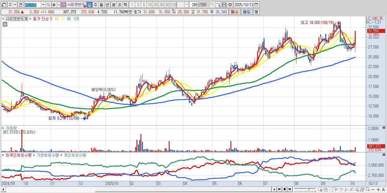 - 사피엔반도체 (31,550원 ▲ 11.88% , 시총: 2,591억, 거래량: 211,403, 거래대금:64억)