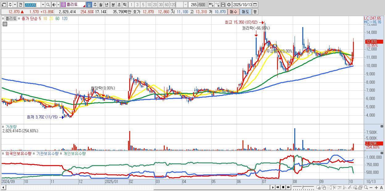 - 플리토 (12,900원 ▲ 14.16% , 시총: 2,129억, 거래량: 1,273,631, 거래대금:162억)