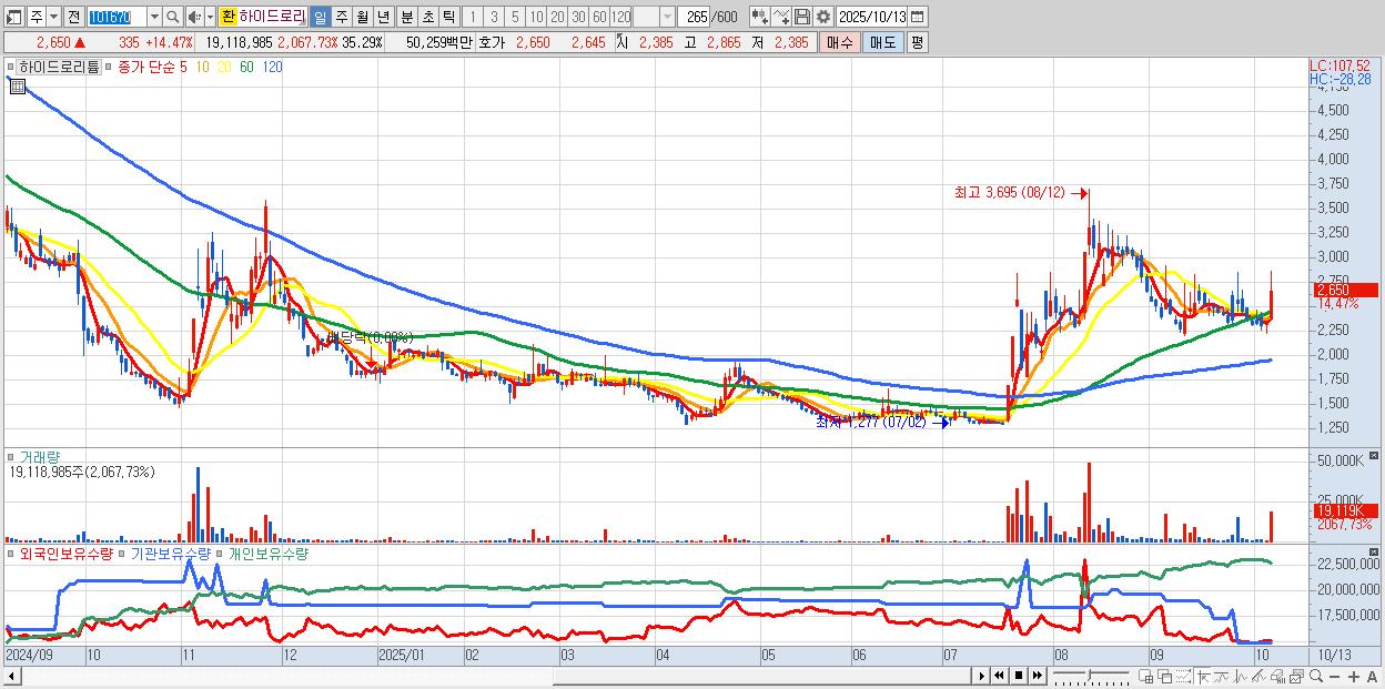 - 하이드로리튬 (2,650원 ▲ 14.47% , 시총: 1,436억, 거래량: 19,118,985, 거래대금:503억)