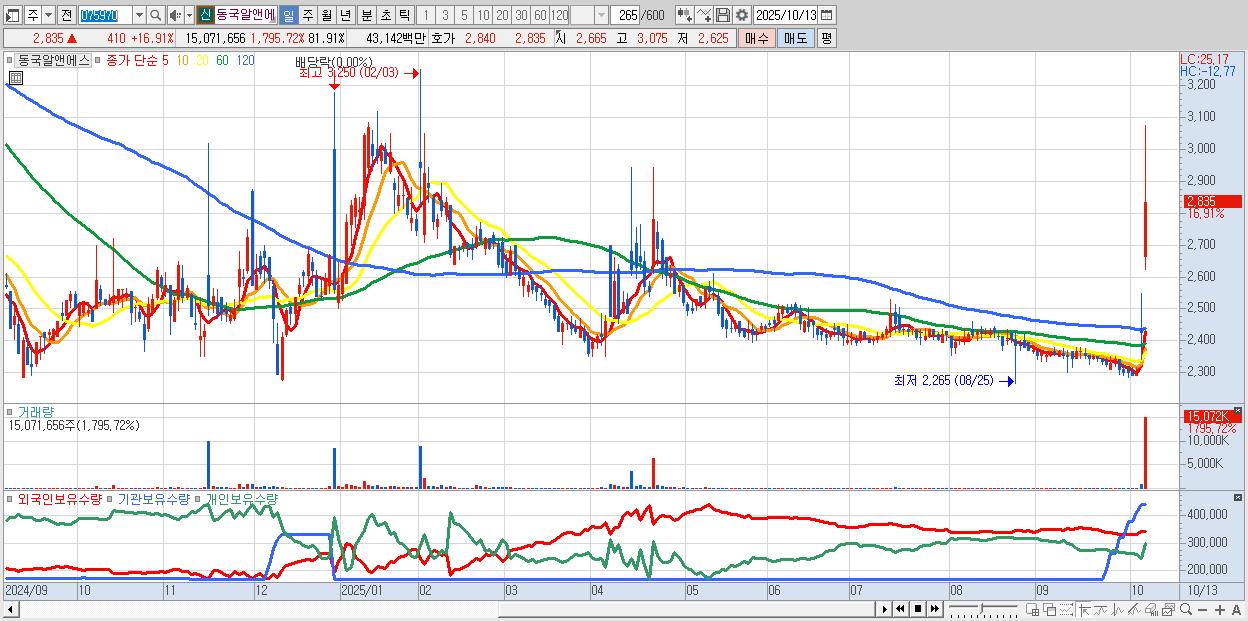 - 동국알앤에스 (2,835원 ▲ 16.91% , 시총: 522억, 거래량: 15,071,656, 거래대금:431억)
