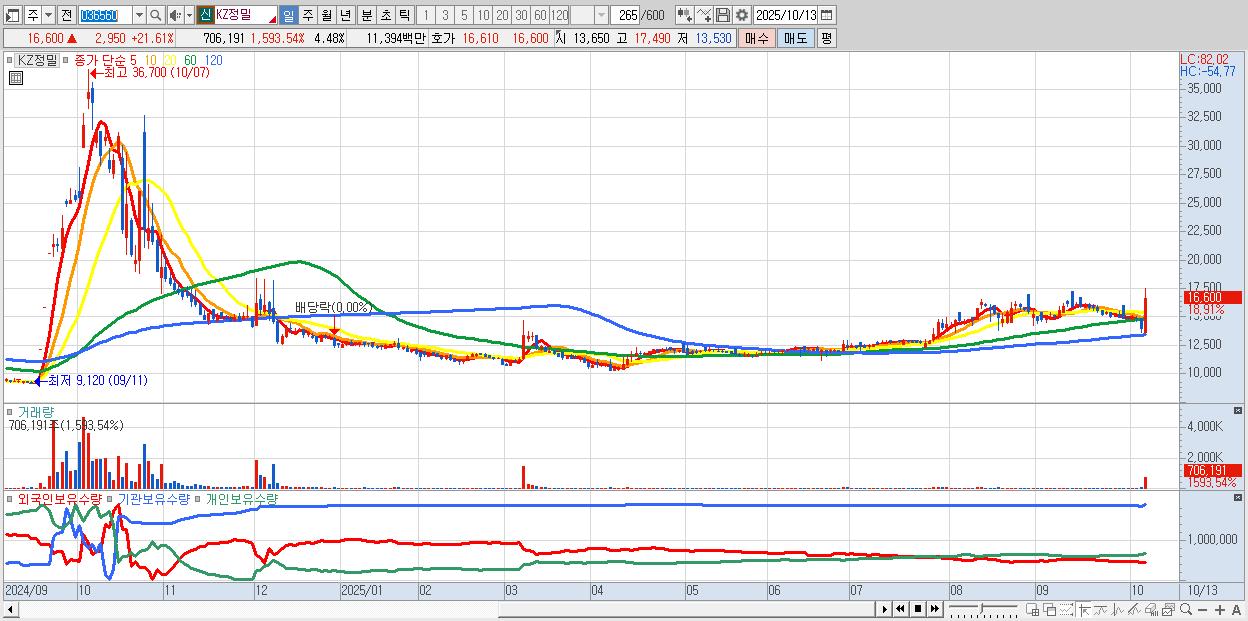 - KZ정밀 (15,460원 ▲ 13.26% , 시총: 2,435억, 거래량: 264,402, 거래대금:42억)