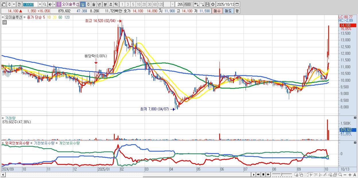 - 오이솔루션 (14,100원 ▲ 16.05% , 시총: 1,498억, 거래량: 879,602, 거래대금:117억)