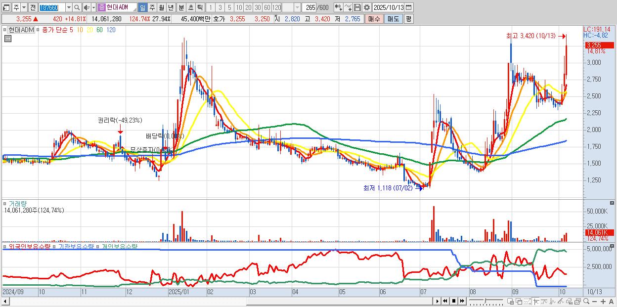 - 현대ADM (3,255원 ▲ 14.81% , 시총: 1,638억, 거래량: 14,061,280, 거래대금:454억)