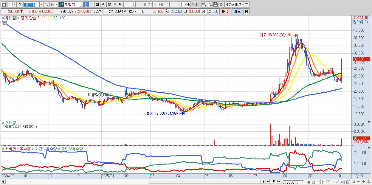 - 새빗켐 (30,550원 ▲ 30% , 시총: 1,720억, 거래량: 978,077, 거래대금:279억)