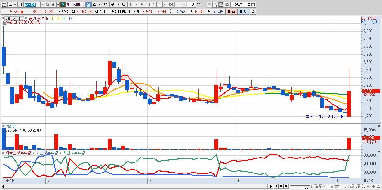 - 케이지에이 (5,560원 ▲ 13.93% , 시총: 672억, 거래량: 8,973,244, 거래대금:531억)