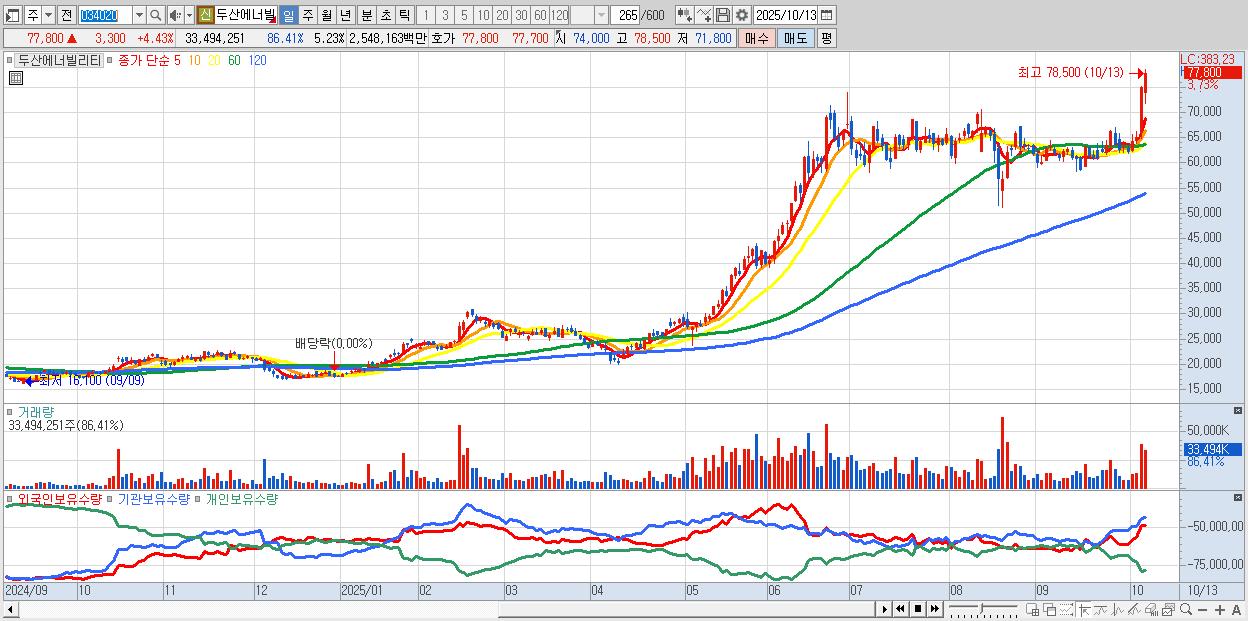 - 두산에너빌리티 (77,600원 ▲ 4.16% , 시총: 497,075억, 거래량: 14,272,165, 거래대금:10,930억, KOSPI)
