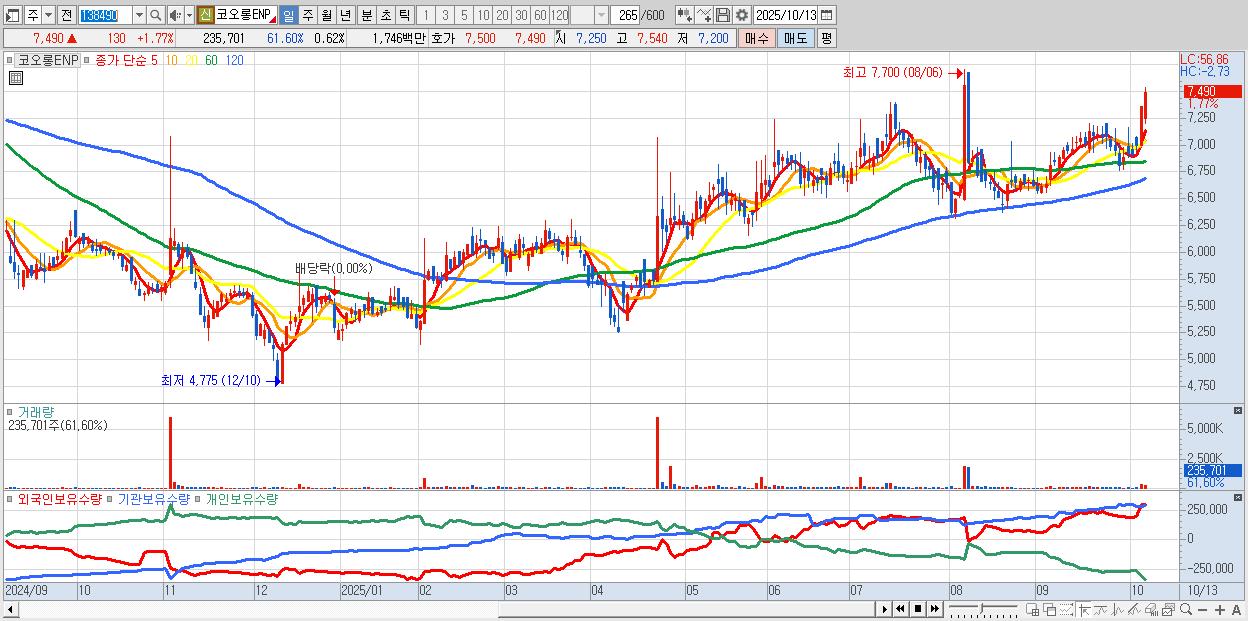 - 코오롱ENP (7,500원 ▲ 1.9% , 시총: 2,850억, 거래량: 118,140, 거래대금:9억, KOSPI)