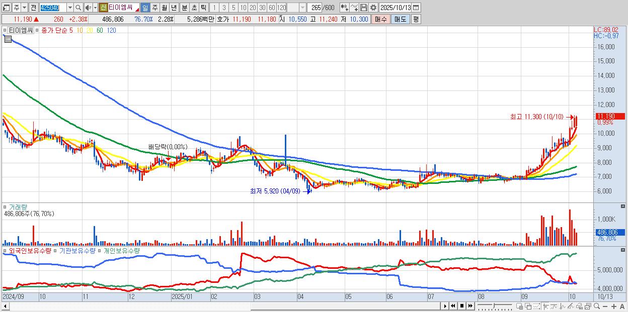 - 티이엠씨 (11,070원 ▲ 1.28% , 시총: 2,361억, 거래량: 264,040, 거래대금:29억, KOSDAQ)