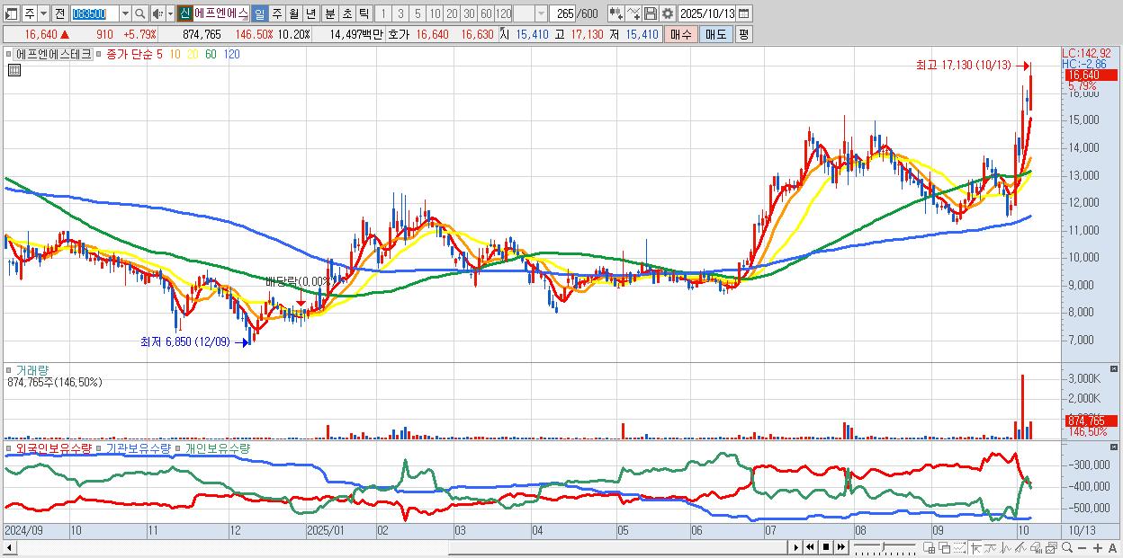 - 에프엔에스테크 (16,640원 ▲ 5.79% , 시총: 1,427억, 거래량: 874,765, 거래대금:145억, KOSDAQ)