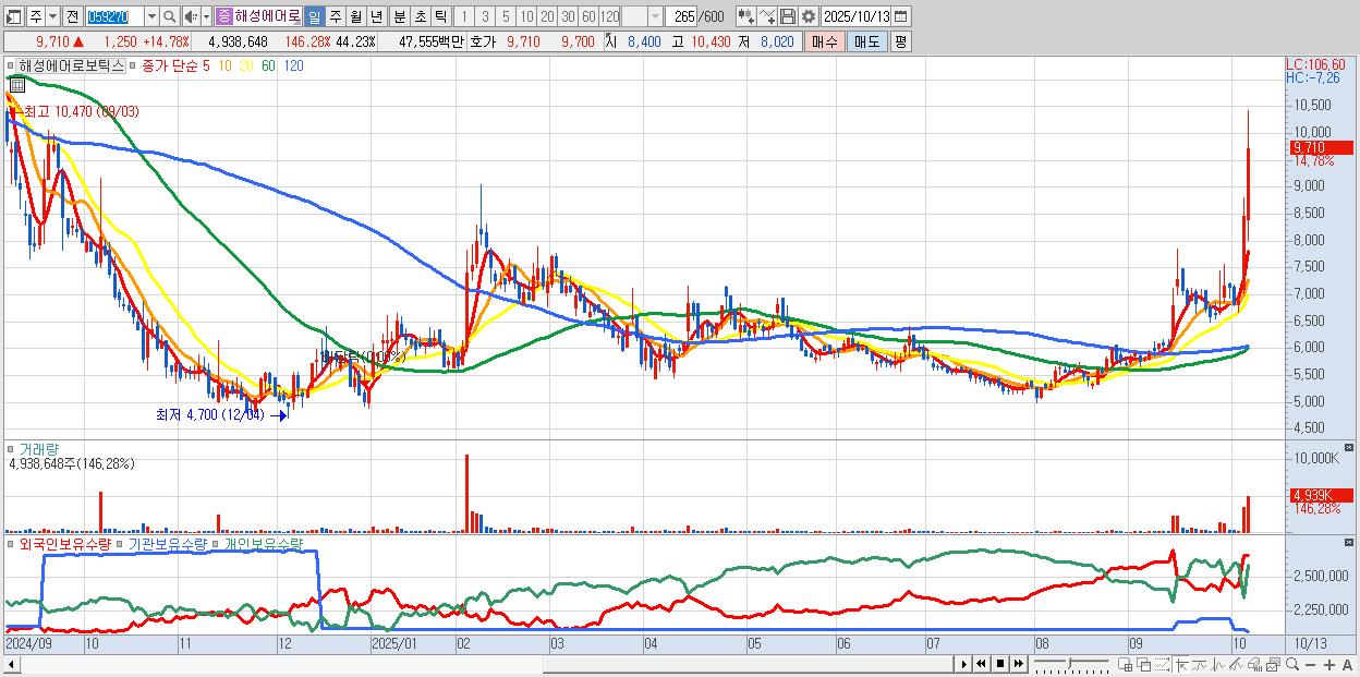- 해성에어로보틱스 (9,710원 ▲ 14.78% , 시총: 1,084억, 거래량: 4,938,648, 거래대금:476억, KOSDAQ)