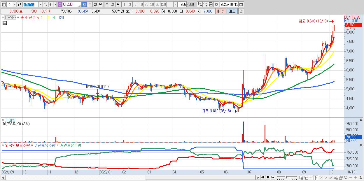 - 아스타 (8,380원 ▲ 3.71% , 시총: 1,219억, 거래량: 70,786, 거래대금:6억, KOSDAQ)