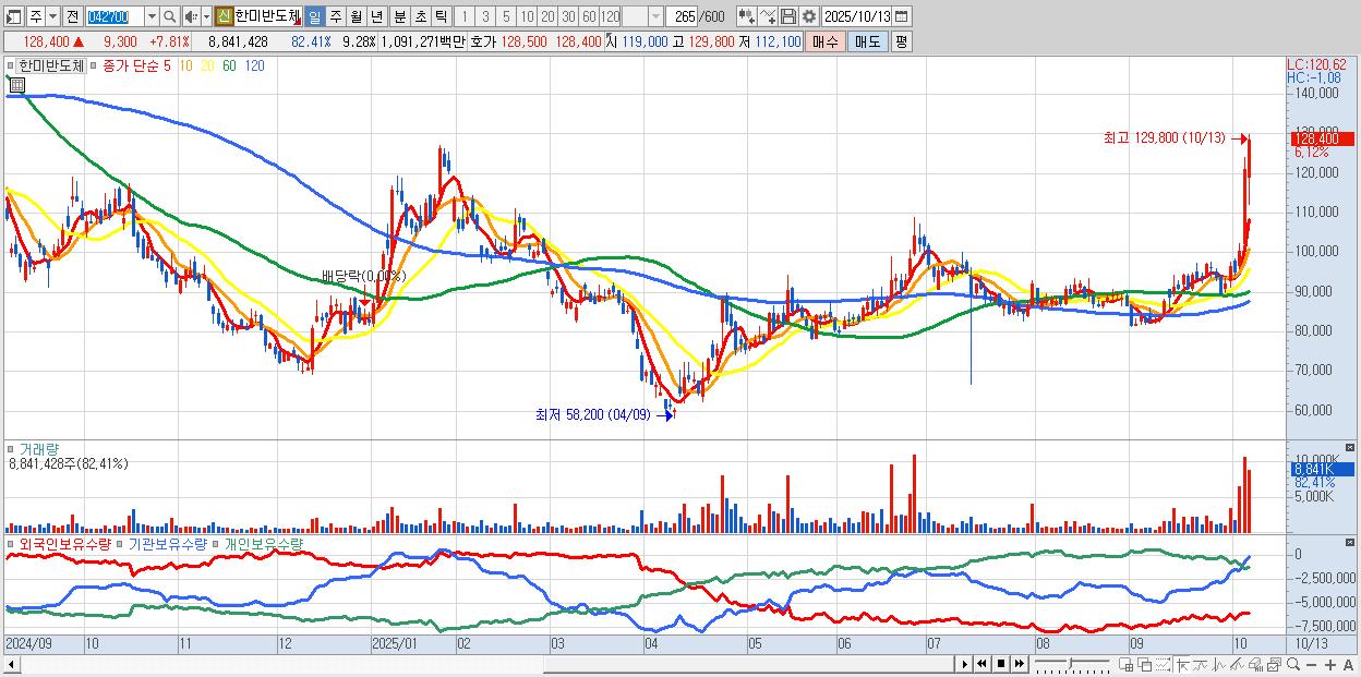 - 한미반도체 (128,000원 ▲ 7.47% , 시총: 122,000억, 거래량: 4,324,161, 거래대금:5,362억, KOSPI)