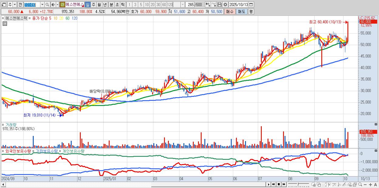 - 에스앤에스텍 (59,800원 ▲ 12.41% , 시총: 12,828억, 거래량: 566,662, 거래대금:321억, KOSDAQ)