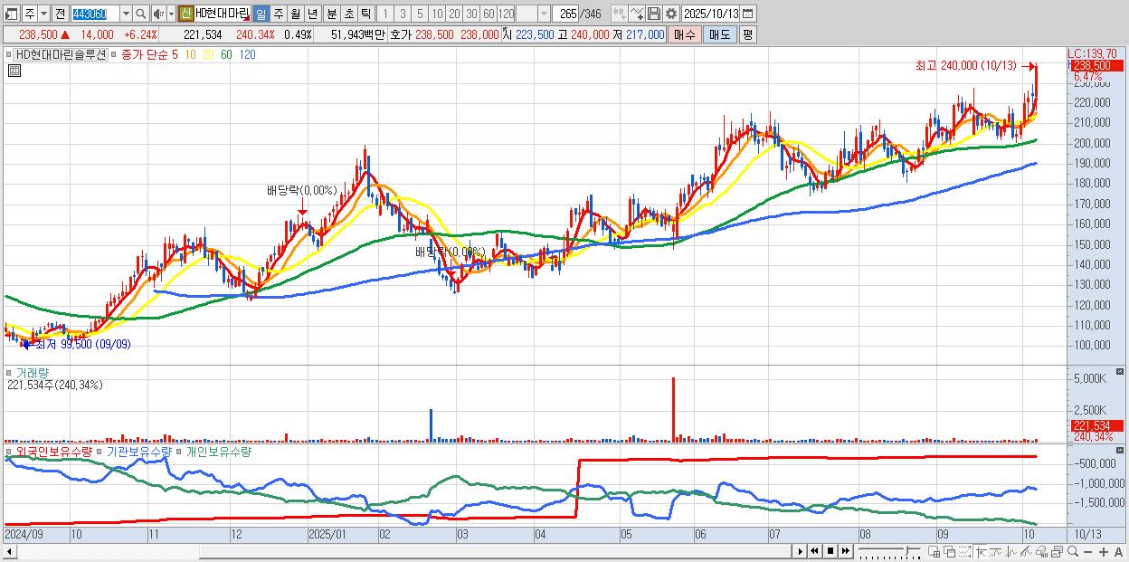- HD현대마린솔루션 (239,500원 ▲ 6.68% , 시총: 107,366억, 거래량: 185,551, 거래대금:436억, KOSPI)