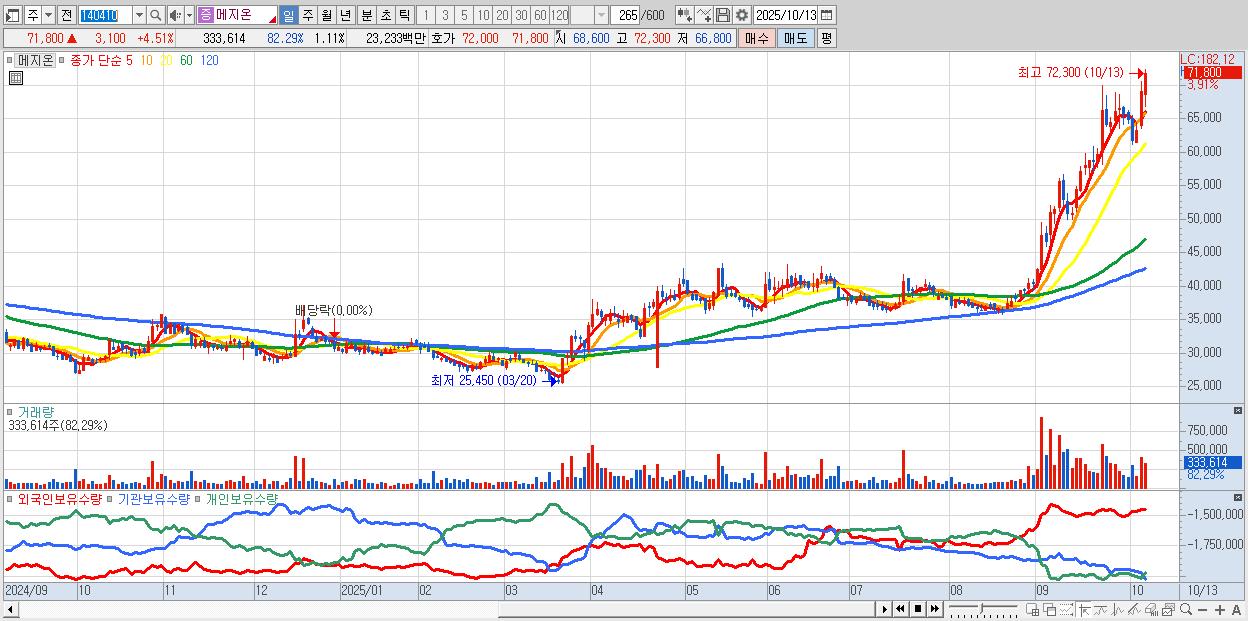 - 메지온 (72,000원 ▲ 4.8% , 시총: 21,683억, 거래량: 200,921, 거래대금:140억, KOSDAQ)