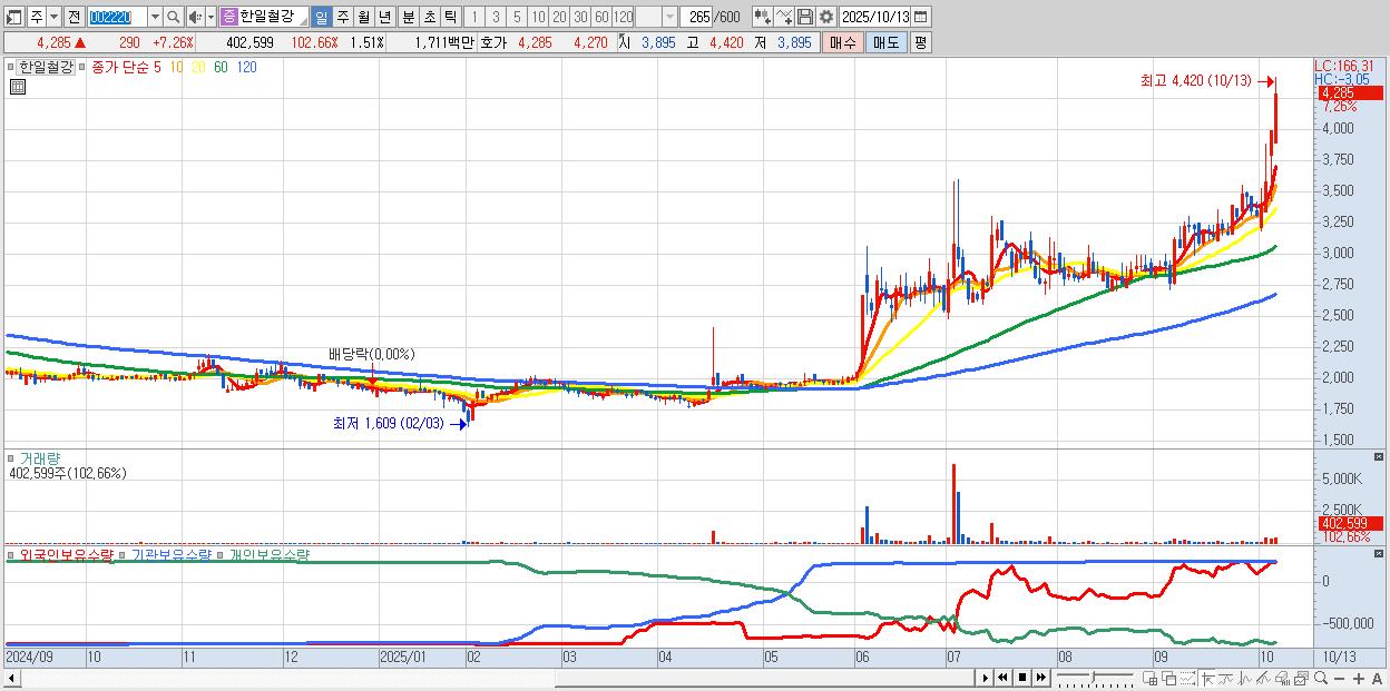 - 한일철강 (4,285원 ▲ 7.26% , 시총: 1,144억, 거래량: 402,599, 거래대금:17억, KOSPI)