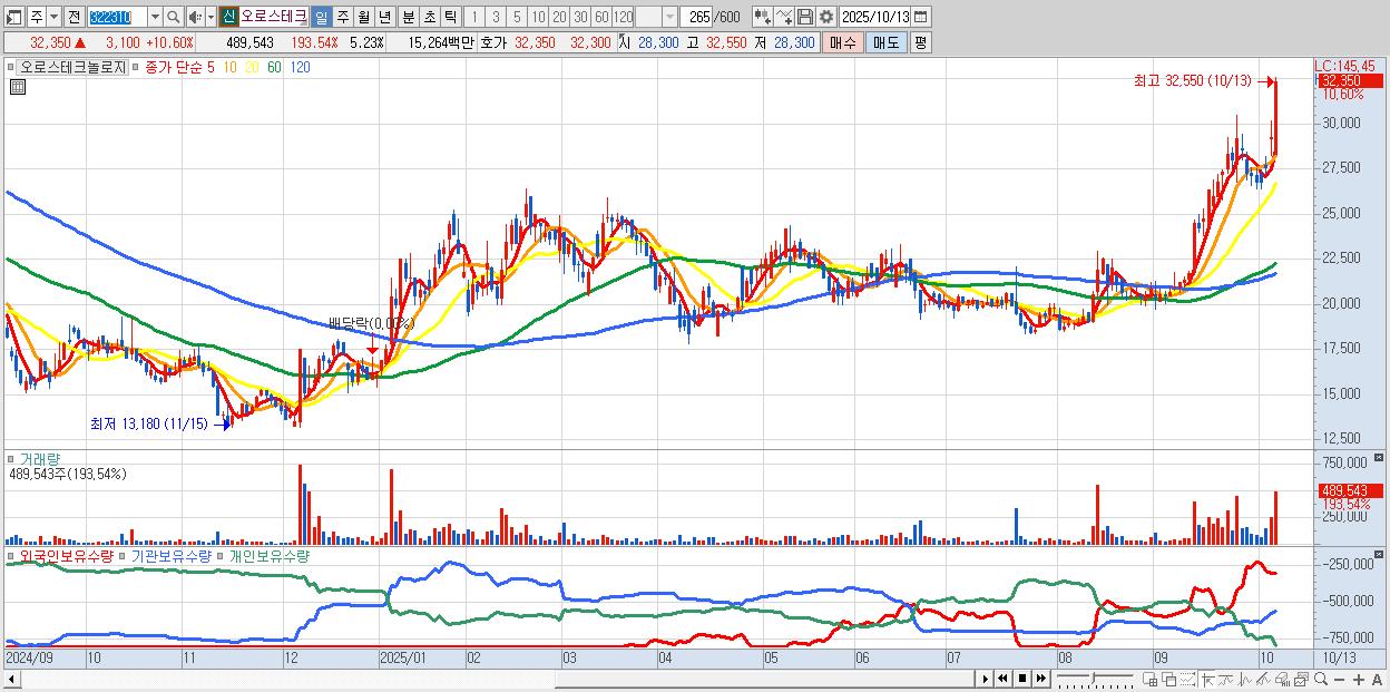 - 오로스테크놀로지 (32,350원 ▲ 10.6% , 시총: 3,030억, 거래량: 489,543, 거래대금:153억, KOSDAQ)