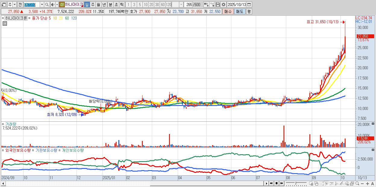 - 하나마이크론 (27,750원 ▲ 13.96% , 시총: 18,390억, 거래량: 3,945,110, 거래대금:1,038억, KOSDAQ)