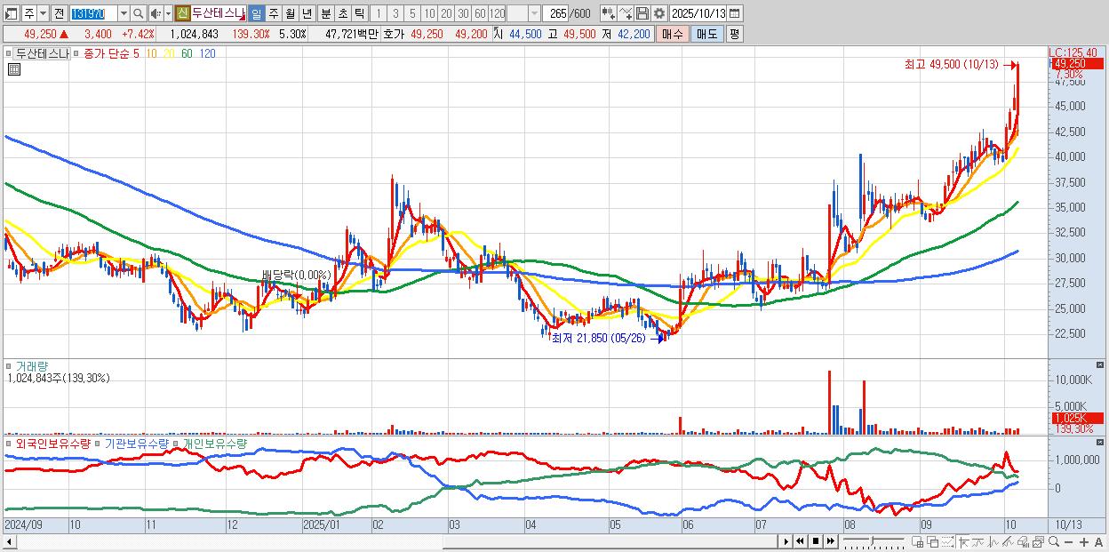 - 두산테스나 (49,200원 ▲ 7.31% , 시총: 9,509억, 거래량: 498,960, 거래대금:233억, KOSDAQ)