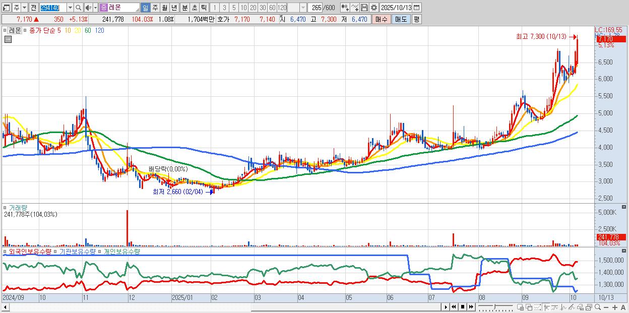 - 레몬 (7,170원 ▲ 5.13% , 시총: 1,607억, 거래량: 241,778, 거래대금:17억, KOSDAQ)