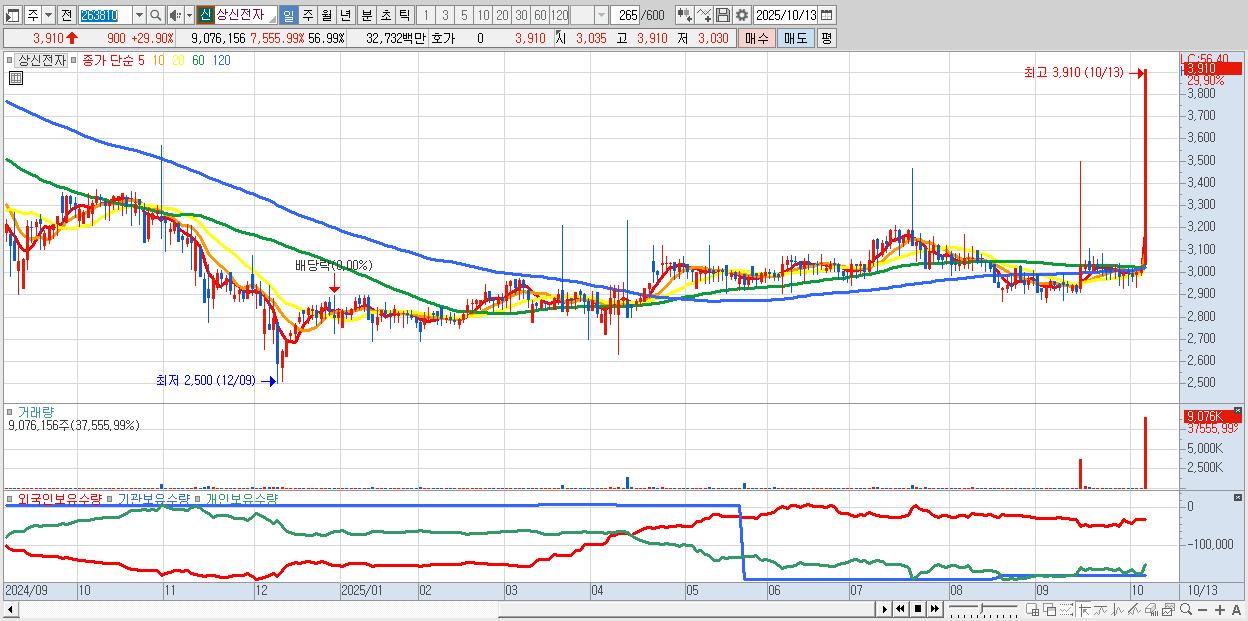 상신전자 3,910원 ▲ 29.9% (KOSDAQ, 263810)