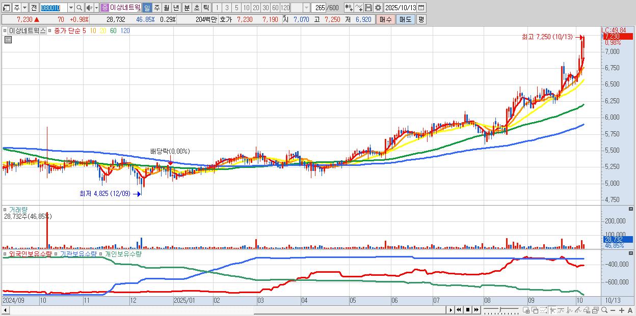 - 이상네트웍스 (7,230원 ▲ 0.98% , 시총: 711억, 거래량: 28,732, 거래대금:2억, KOSDAQ)
