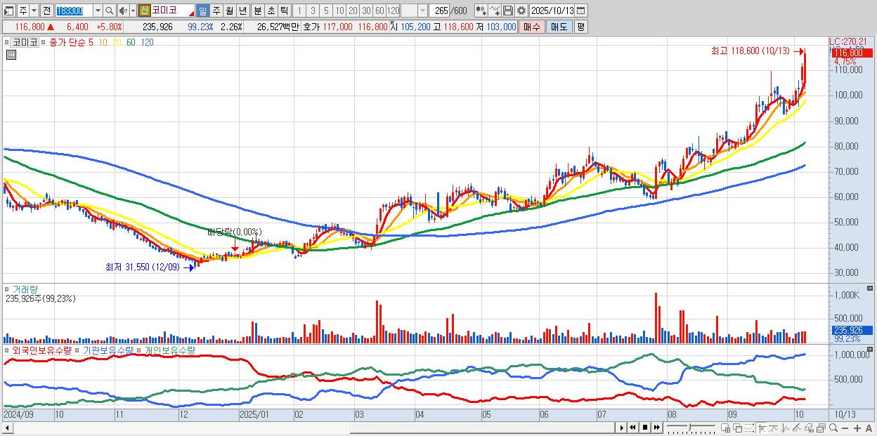 - 코미코 (116,700원 ▲ 5.71% , 시총: 12,208억, 거래량: 170,007, 거래대금:192억, KOSDAQ)