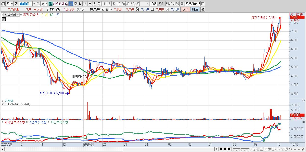 - 샘씨엔에스 (7,790원 ▲ 4.42% , 시총: 4,548억, 거래량: 2,194,297, 거래대금:168억, KOSDAQ)