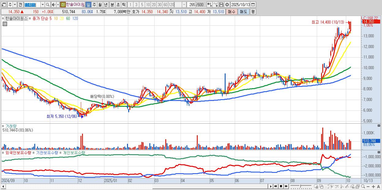 - 한솔아이원스 (14,350원 ▲ 1.06% , 시총: 4,103억, 거래량: 510,744, 거래대금:71억, KOSDAQ)