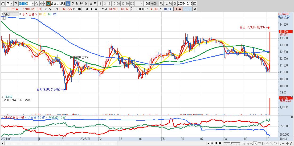 - 일진다이아 (13,970원 ▲ 26.31% , 시총: 1,984억, 거래량: 2,258,399, 거래대금:305억, KOSPI)