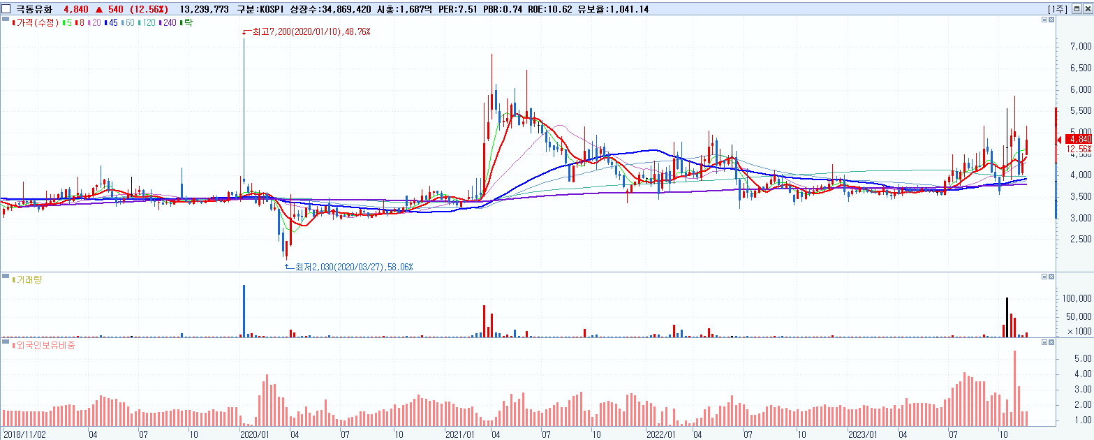 - 극동유화 (4,840원 ▲ 12.56% , 시총: 1,688억, 거래량: 13,303,694, 거래대금:650억)