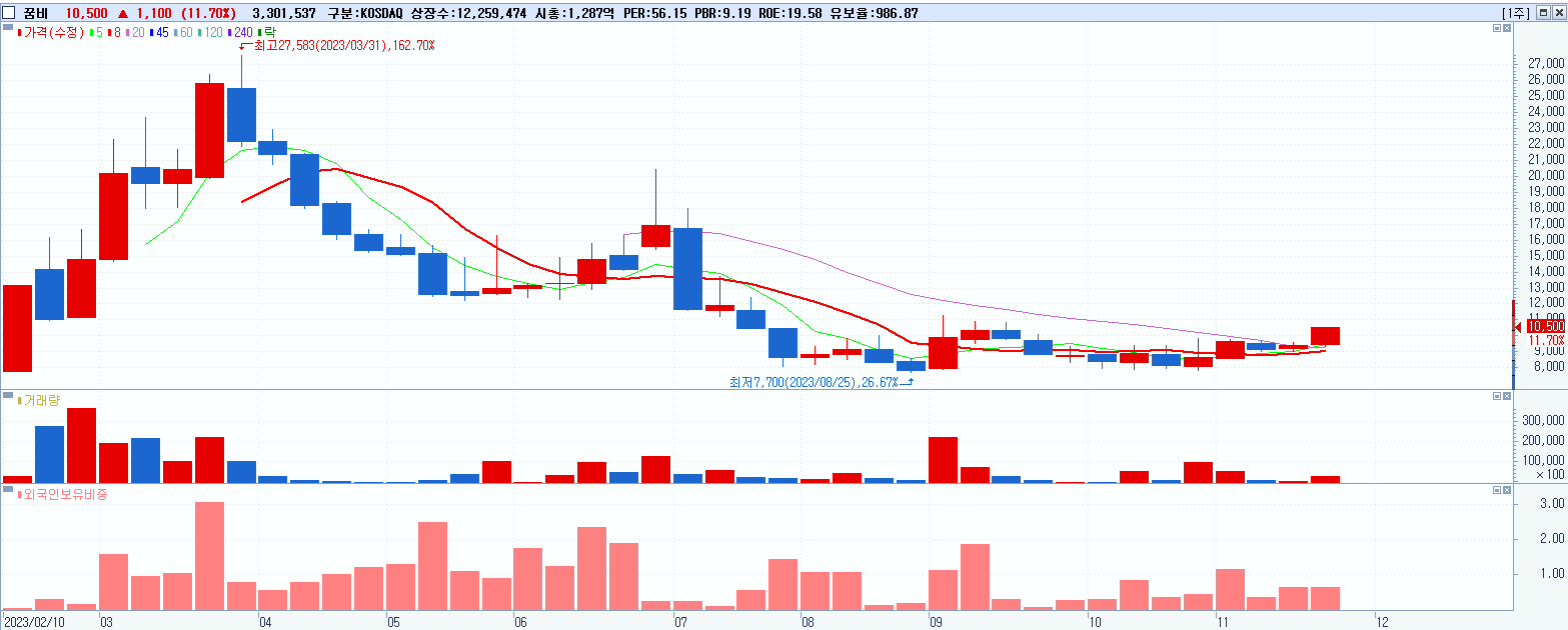 - 꿈비 (10,500원 ▲ 11.7% , 시총: 1,287억, 거래량: 3,360,756, 거래대금:341억)