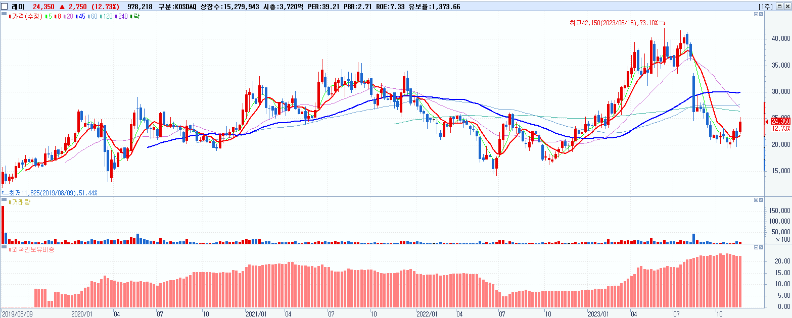 - 레이 (24,350원 ▲ 12.73% , 시총: 3,721억, 거래량: 979,878, 거래대금:236억)