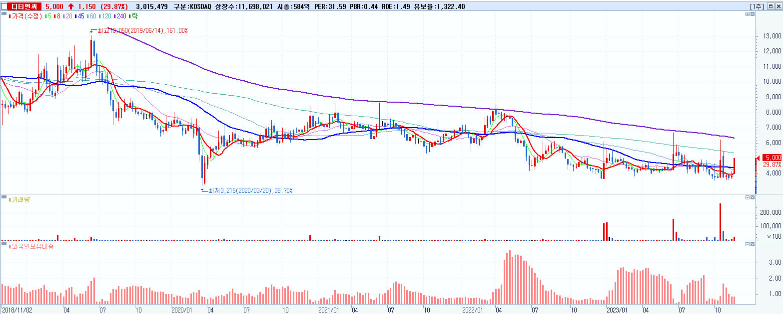 - 디티앤씨 (5,000원 ▲ 29.87% , 시총: 585억, 거래량: 3,016,344, 거래대금:141억)