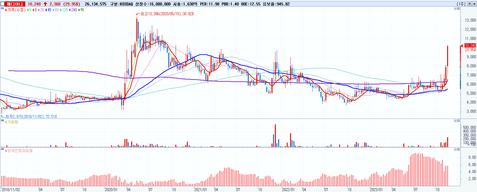 4.메디아나 10,240원 ▲ 29.95% (KOSDAQ, 041920)