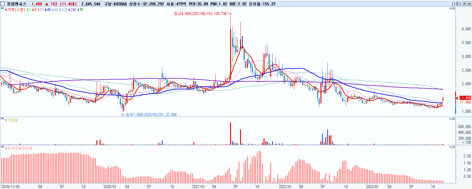 29.정원엔시스 1,488원 ▲ 11.46% (KOSDAQ, 045510)
